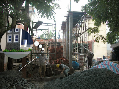 Toàn cảnh công trường trước khi đổ tấm lửng : tập kết cát , đá, xi măng...